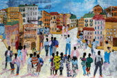 Other works explore notions of fantasy and the absurd, influenced by European surrealism, while others are inspired by the urban fabric of Chicago. The latter includes “Street Scene II” by U. of I. alumnus Allen Stringfellow. The collage and watercolor on paper presents a vibrant social event as residents, cut from paper and patterned textiles, gather amid the buildings of a Chicago neighborhood. Stringfellow plays with a sense of rhythm through the arrangements of color and pattern, evocative of the jazz music he listened to in his youth.