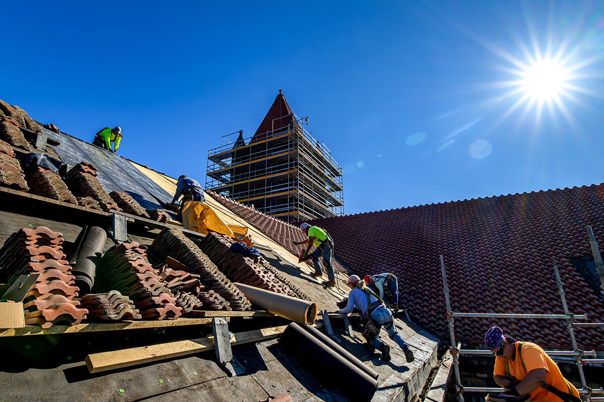 On the opposite side of the building, a construction crew is standing on the slope of the roof below the bell tower. They are removing the terra cotta roof tiles and stacking them on planks along the roof. The copper gutters will be removed, and steel supports added on the underside of the roof. The workers are adding a new plywood deck on the roof and unrolling material that serves as an ice and water shield. When they’re finished, they’ll reinstall the gutters and tiles.