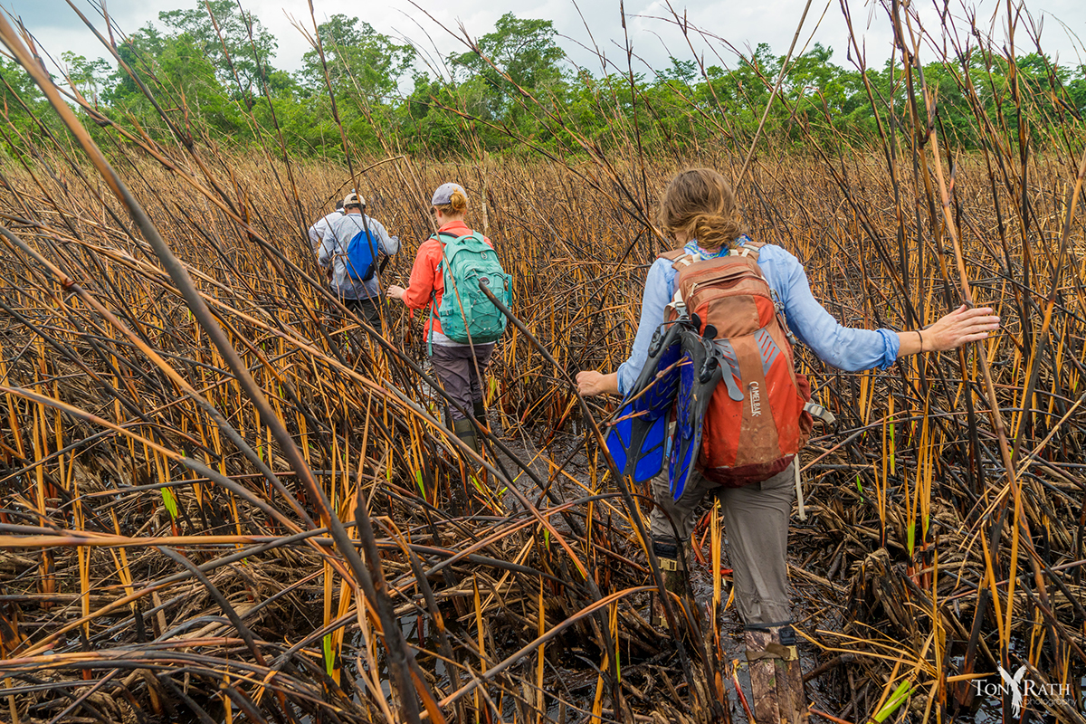At the edge of the jungle, however, we are met with cutting grass, aptly named for its razor-sharp edges, rising well above our heads. The knee-deep water hides holes that catch us unaware.